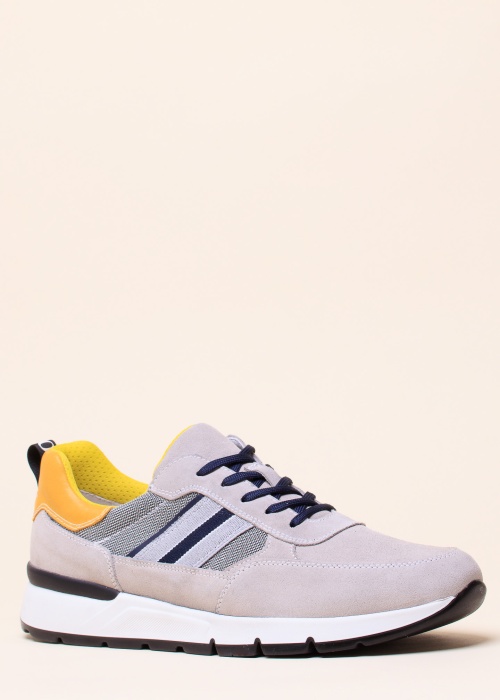 Мужские повседневные кроссовки NeroGiardin с замшевым верхом идеально подходят для повседневной носки. Текстильные детали на внешней стороне обуви придают изысканность общему образу. Гладкая кожаная деталь расположена на пятке, с фирменным ухватом на заднике. Внутренняя отделка также выполнена из комбинации текстиля и искусственной кожи, которая приятно комфортна на ноге владельца. Стелька имеет перфорацию для улучшения воздухопроницаемости и является съёмной и заменяемой для более удобной посадки. Подошва имеет резиновый протектор для хорошего сцепления с поверхностью. Ботинок 45-го размера весит 557 г.