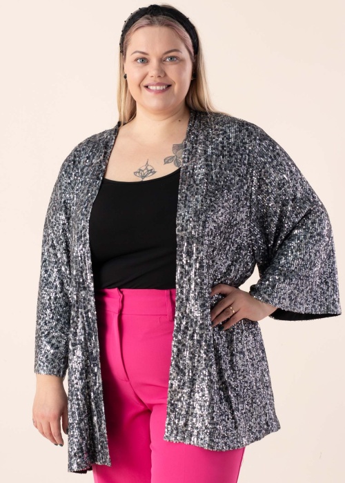 Праздничный жакет Simple Wish украсит Тебя на празднике или театральным вечером. Эффектный и рукава-кимоно жакет- блестящий и хорошо обвисающий. Спереди имеет без застёжек и блестящие пайетки добавляют выразительности. Блестай и мир ответит тебе улыбкой! Рост модели - 167 см и носит размер 46/48.