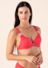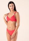 Sarkans Milavicas bikini krūšturis Sansara ir skaists un vasarīgs. Bikini ir bļodiņas ar atbalsta stīpiņām un platas plecu lentes, ko rotā tamborētas detaļas un skaisti volāni, kas piešķir krāšņumu un sievišķību. Krūšturis uz muguras aizdarāms ar skavu, plecu siksnas regulējamas, priekšpusi rotā neliels zeltīts piekariņš. Modeles augums 176 cm, valkā 75B izmēru. Materiāls: poliamīds 75%, poliesters 15%, elastāns 10%. Krāsa: sarkana.