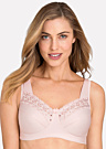 Miss Mary of Sweden sieviešu krūšturis Broderie Anglaise ir ērts un sievišķīgs apģērbs, kas izgatavots no bieza auduma un rotāts ar mežģīnēm, nodrošinot patīkamu pieskārienu un dinamisku izskatu. Šis mīkstais krūšturis bez atbalsta stīpiņām tevi nepievils, sniedzot komfortu un eleganci ikdienas valkāšanai.