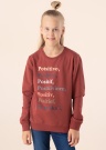 Sarkanbrūnais Name It džemperis Lotal ir pozitīvisma pilns! Džemperim ir ērts plašs piegriezums, mazs apaļš izgriezums un garas piedurknes. Vidēji biezs audums ir izgatavots no ādai un dabai draudzīgas organiskās kokvilnas, un tā interjers ir mazgāts un brīnišķīgi mīksts! Priekšpuse ir dekorēta ar vārdu "pozitīvs" dažādās krāsās un dažādās valodās. Modelis ir 146 cm garš un valkā 146. izmēru. Materiāls: 95% organiskā kokvilna, 5% elastāns. Krāsa: brūns