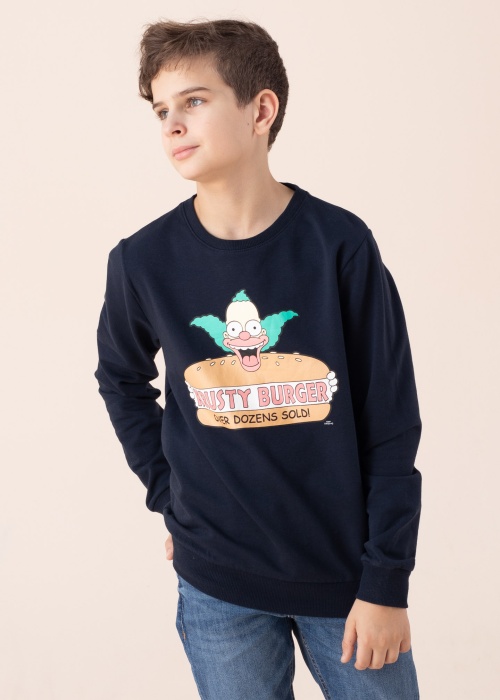 Simpsonu multfilmai veltītais Name It džemperis ir patīkami mīksts, ērti elastīgs un, par laimi, neformāls, lieliski piemērots jūsu iecienītākajiem džinsiem. Priekšpusē ir Homēra iecienītākais Krusty burgera motīvs. Modelis ir 146 cm garš un valkā 146. izmēru. Materiāls: kokvilna 95%, elastāns 5%. Krāsa: tumši zila