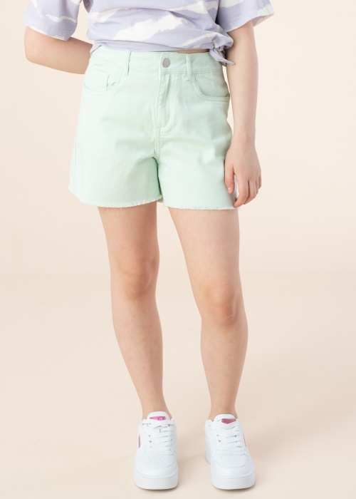 Jaukas Name It Kids bikses der valkāšanai ikdienā. Vasarīgas neelastīga denima bikses ir ar paaugstinātu jostasvietu un ar neapstrādātām malām. Vidukļa dala aizdarāma ar pogu un rāvējslēdzēju, priekšpusē un aizmugurē ir atvērtas kabatas. Apkārtmēru ļauj regulēt tuneļa gumija ar pogām iekšpusē. Foto: augums 147 cm valkā 152 izmēru.