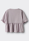 Name It bērnu meiteņu T-krekls Friana ir lieliska izvēle dažādām dienām, pateicoties tā vienkāršajam dizainam un mirdzošajam izskatam. Krekls ir aprīkots ar apaļu kakla izgriezumu un īsām piedurknēm, kas piešķir tam elegantu un modernu izskatu. Regulārs piegriezums un krokojums viduklī nodrošina komfortu, savukārt burvīgā riša piedurkņu galos piešķir papildu šarmu.
