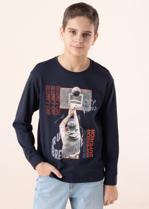 Ikdienišķs Name It Kids t-krekls der valkāšanai skolā, mājās vai pavadot laiku kopā ar draugiem. Mīkstas kokvilnas t-krekls ir tīra stila un ar garām piedurknēm un priekšpusi rotā izteiksmīgs drukas attēls. Foto: augums 153 cm valkā 146 izmēru.
