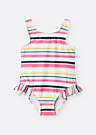 Mini meiteņu peldkostīms Zanne ir lieliska izvēle vasaras dienu baudīšanai. Tas ir veidots ar svītrainu rakstu, kas piešķir tam meitenīgu un apburošu izskatu. Peldkostīms ir praktisks un elastīgs, nodrošinot komfortu un kustību brīvību. Sānos esošā apburošā riša piešķir papildu šarmu un eleganci.