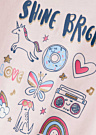 Mini meiteņu T-krekls Veen ir lielisks papildinājums jebkurai garderobei. Tas ir izgatavots no mīksta auduma un aprīkots ar īsām piedurknēm un apaļu kakla izgriezumu, kas nodrošina komfortu visas dienas garumā. Priekšpusē esošais drukas attēls un mirdzošie elementi piešķir kreklam īpašu šarmu un pievilcību.