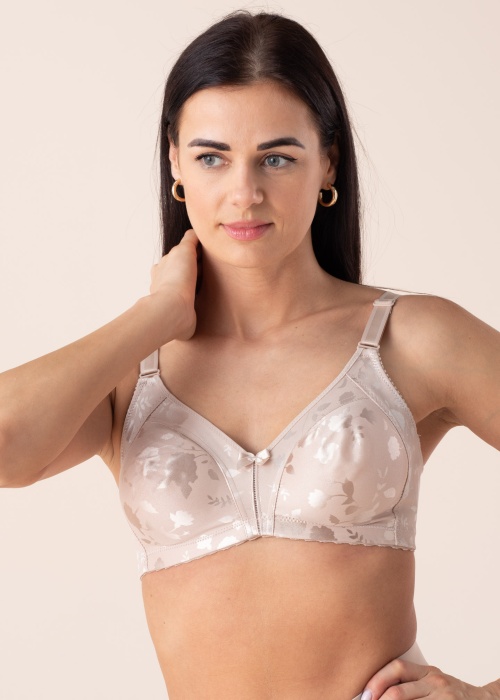 Naturana krūšturis ar elegantu ziedu rakstu nodrošina valkāšanai perfektu atbalstu un optimālu piemērotību. Elastīgs krūsturis bez šuvēm ideāli saplūst ar valkātāja ādu, un elastīga veļas gumija apakšmalā un platākas regulējamas plecu lentes nodrošina valkāšanai lielisku komfortu, neradot neērtu berzi. Krūšturis muguras daļā aizdarāms ar ērtu divrindu un trīspakāpju āķa aizdari. Modeles augums 167 cm, valkā 85D izmēru. Materiāls: poliamīds 93%, elastāns 7%. Krāsa: bēša.