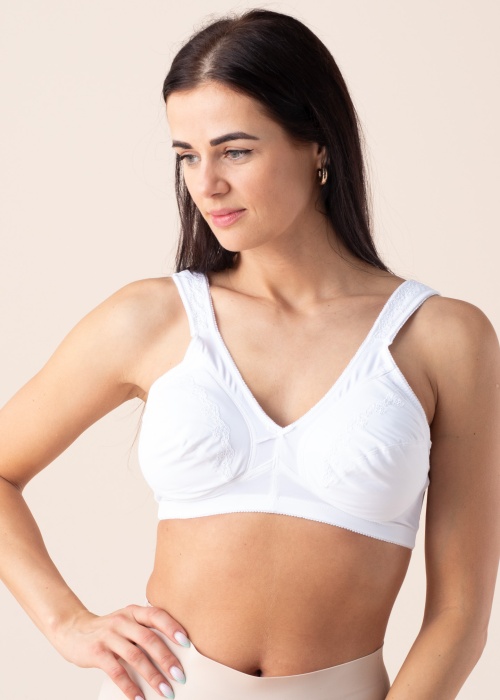 Naturana krūšturis bez atbalsta lokiem valkāšanai ir ārkārtīgi ērts un ar patīkamu atbalstu! Virspusi rotā pieticīgs mežģīņu rotājums, krūšu daļas iekšpusē patīkami mīksta odere ar kokvilnas audumu. Platās plecu siksnas ir regulējamas, krūšturis aizdarāms ar trīs rindu un trīs pakāpju aizdari. Modeles augums 167 cm, valkā 85D izmēru. Materiāls: poliamīds 85%, elastāns 15%. Krāsa: balta.