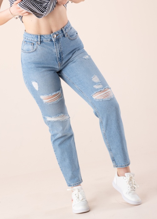 Jaukas, jauniešiem piemērotas Noisy May Mom piegriezuma džinsu bikses Isabel ir ideālas valkāšanai brīvajā laikā. Augstā jostas daļa priekšpusē aizdarāma ar rāvējslēdzēju un pogu. Džinsa bikšu modelim kopumā ir piecas kabatas, no kurām divas atrodas aizmugurē, bet trīs – priekšpusē. Džinsu biksēm ir dilināts efekts, kas padara tās jauneklīgas un stilīgas. Audums ir izturīgs, ļaujot biksēm saglabāt savu formu. Modele ir 169 cm gara, valkā 27. -32. izmēru. Materiāls: kokvilna 100%. Krāsa: gaiši zila.