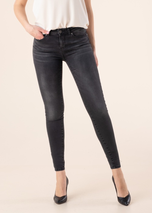Noisy May džinsiem Lucy ir cieši pieguļošs piegriezums, vidēja augstuma viduklis un īpaši izdilis efekts piegulošo kāju daļā. Klasisko 5 kabatu modeli var piestiprināt ar pogu un rāvējslēdzēju priekšpusē. Modelis ir 178 cm garš un nēsā 27/32 izmēru. Materiāls: BCI apstiprināta kokvilna 98%, elastāns 2%. Krāsa: nodilusi melna