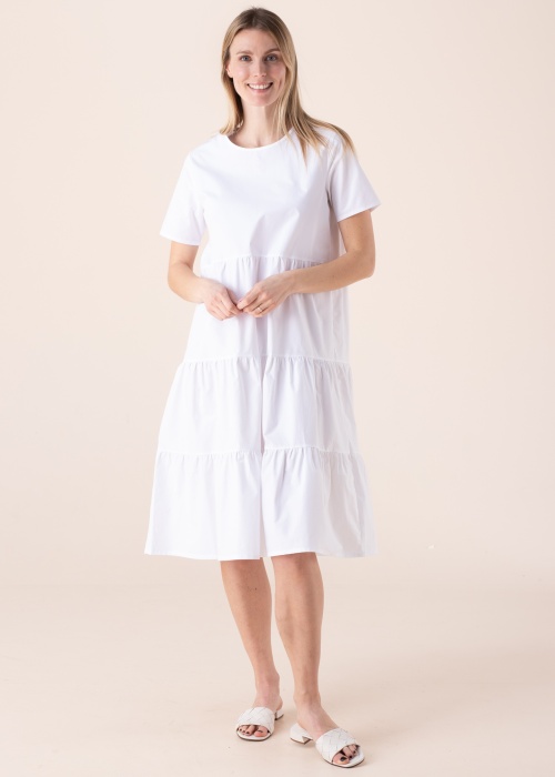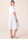 Katras sievietes garderobē ir viena vienkārša un klasiska kleita, par kuru vienmēr priecāties! Kleitai ir apaļa apkakle, kas aizdarāma ar pogu un svārku daļa, ko veido volāni, sākot no vidukļa, perfekti papildina apģērba minimālismu. Ādai draudzīgs kokvilnas audums ļauj ķermenim elpot un ir zīdaini mīksts. Modele ir 177 cm gara, valkā S izmēru. Kleitas garums no apkakles līdz apakšmalai 110 cm. Materiāls: kokvilna 100%. Krāsa: balta.
