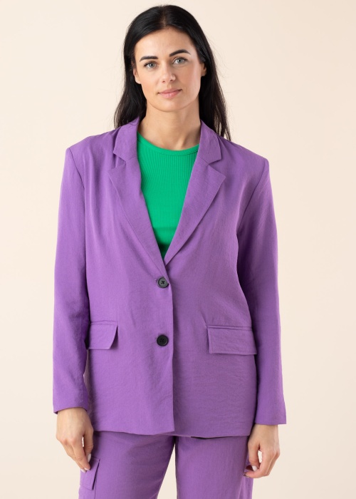 Spilgta Noisy May žakete pārstāv klasiku. Lietišķa ar atlokamu apkakli žakete ir ar brīvāka piegriezuma plāna un viegla. Priekšpusē pogu aizdare, sānos kabatas ar atlokiem un uz pleciem plecu spilventiņi. Foto: augums 176 cm valkā S izmēru.