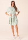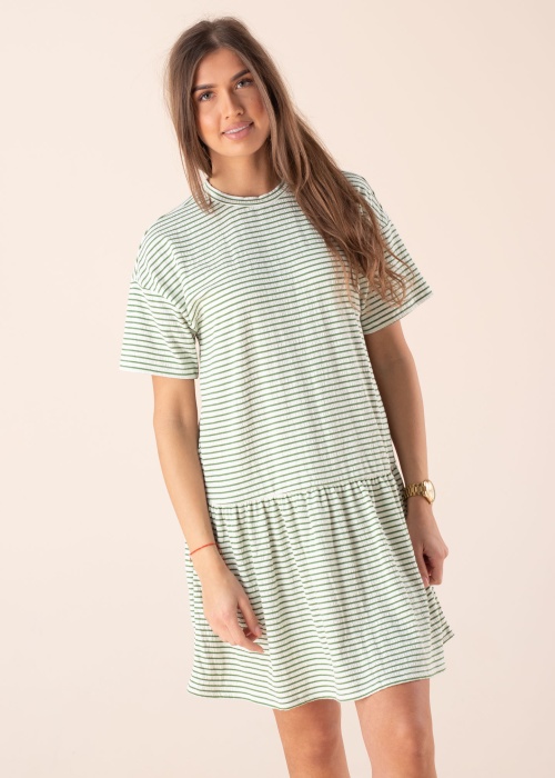 Vasarīgi svītrainā Object kleita Luca Nana ir ideāla izvēle vasaras sezonai. Kleita ar apakļu kakla izgriezumu, audums ir elastīgs un mīksts, lai justos ērti ikdienas gaitās. Akcentu un formu piešķir elegants volāns apakšmalā. Modeles augums 178 cm, valkā S izmēru. Garums no apkakles līdz apakšmalai piešķirtajam izmēram ir 88 cm. Materiāls: kokvilna 48%, poliesters 47%, elastāns 5%. Krāsa: zaļa/rakstaina.