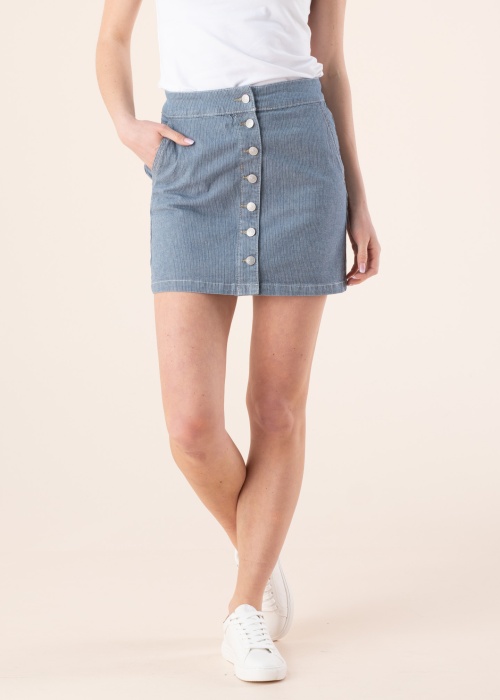 Smalka svītrojuma raksts Object svārkiem Jaisa ir pogu aizdare priekšpusē un divas atvērtas kabatas. Svārku materiāla vieglā elastība piešķir valkāšanas komfortu. Modeles augums ir 177 cm un valkā S. izmēru. Dotā izmēra svārku garums 40 cm.