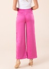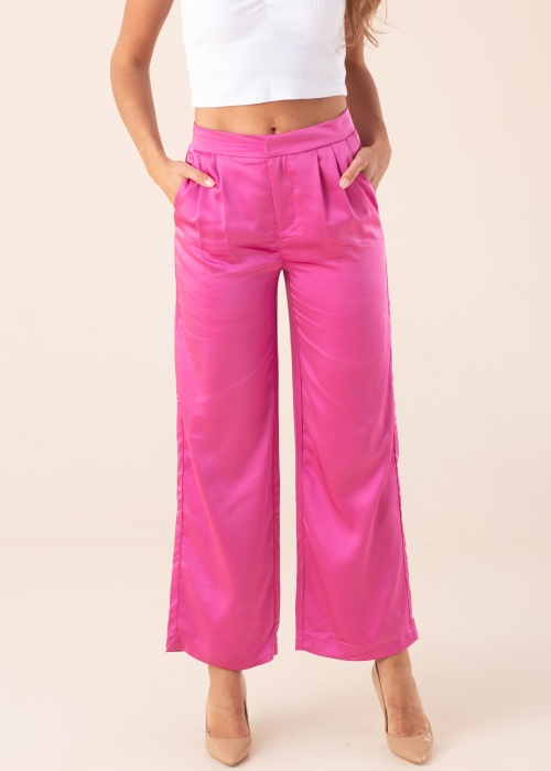 Spīdīgs zīds Only bikses Mayra ir sievišķīgas un stilīgas, piemērotas gan biroja, gan vakara pasākumiem. Biksēm ir taisnas kājas, vidēja augstuma viduklis un atvērtas kabatas sānos. Josta ir piestiprināta ar āķi un sprādzi. Modelis ir 178 cm garš un valkā 36/32 izmēru. Materiāls: 100% poliesters. Krāsa: rozā