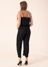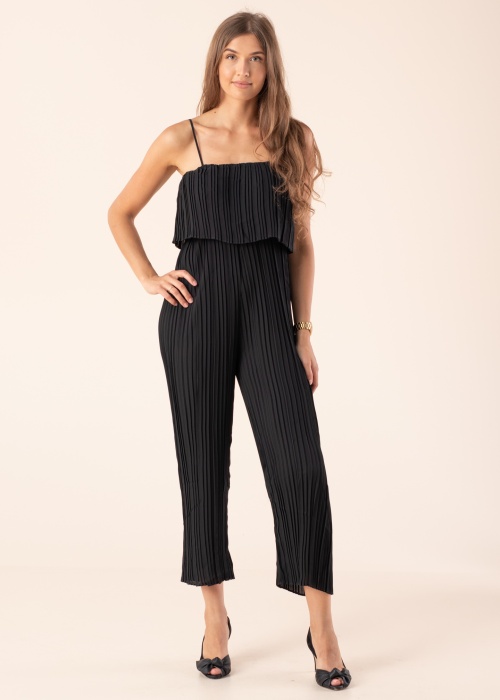 Patiesi sievišķīgs bikškostīms, kas ir stilīgs un pamanāms. Audums ir brīvi krītošs un gaisīgs. Bikšu garums virs potītei ir stilīgs un moderns. Plats piegriezums augšdaļā, plecu lenču garums ir regulējams, iešūta gumija zem krūšu daļas. Modele ir 178 cm gara un valkā 36. izmēru.Materiāls: 100% poliesters. Krāsa: melna