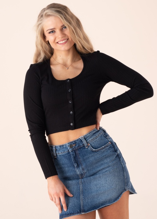 Brīnišķīgā Onlija blūze ar garām piedurknēm Kaya ir jauks apģērbs katras sievietes garderobei! Blūze ar īsāku Crop piegriezumu priekšpusē aizdarāma ar pogām, skaists, ovāls kakla izgriezums piešķir apģērbam sievišķību. Valnīša stila auduma elastība skaisti pielāgojas ķermenim un materiāla maigums pat saplūst ar valkātājas ādu. Ideāls apģērbs valkāšanai ar dažādām biksēm un svārkiem kuru piegriezums ir ar augstu jostasvietu! Modeles augums 169 cm, valkā S izmēru.