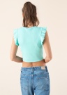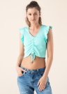 Vasarīga Only blūze ir populāra un jauneklīga. Meitenīga ar V-veida kakla izgriezumu blūze ir ar īsāku piegriezumu mīksta un elastīga. Akcentu pievieno tuneļa aukla uz apkakles , kā arī uz pleciem ir apburošas rišas. Foto: augums 177 cm valkā S izmēru.