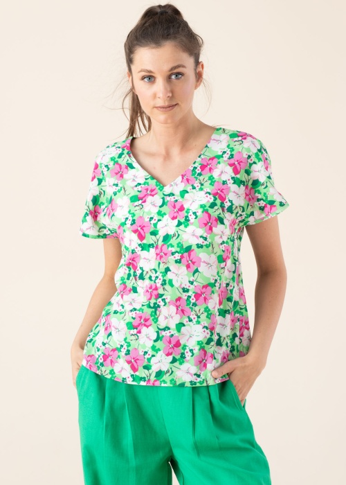 Retrostils Only blūze der valkāšanai ikdienā mājās, darbā, kā arī brīvdienās. Plāna ar ziedu rakstu blūze ir ar V-veida kakla izgriezumu un ar brīvāka piegriezuma. Izbaudi garastāvokli paaugstinošo krāsu enerģiju! Foto: augums 177 cm valkā S izmēru.