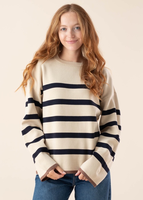 Ar svītrainu rakstu Only džemperis parūpējies, lai varētu labi justies visu garo dienu. Pievilcīgs džemperis ir ērti un ar brīvāka piegriezuma. Saskaņo ar saviem iecienītākajiem džinsiem un jūties pārliecināti. Foto: augums 174 cm valkā S izmēru.