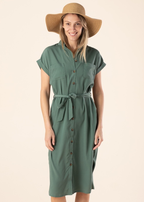 Hannover krekla kleita ir eleganta un daudzpusīga izvēle, kas iemieso klasisku stilu ar savu atloka apkakli un plūstošo siluetu. Kleita ir viegla un aprīkota ar pogu aizdari priekšpusē, kā arī atvērtu kabatu uz krūtīm un sasienamu jostu viduklī, kas piešķir tai eleganci un praktiskumu. Modeles augums ir 177 cm, un viņa valkā 36. izmēru.