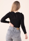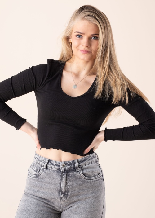 Only blūze Oda, ar īsāku Cropped stilu un V-veida kakla izgriezumu un ar garām piedurknēm, ir ideāla valkāšanai ikdienā, iestājoties siltākai sezonai. Šī, no elastīga auduma izgatavotais blūze ērti pielāgojas ap valkātājas ķermeni. Piedurkņu galos un apakšmalā skaisti veidots krokojums, kas papildina un niansē kopējo iespaidu. Modeles augums 169 cm, valkā S izmēru.