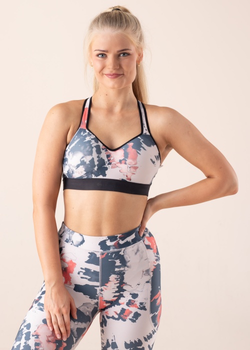 Only Play sporta krūšturis Boon ir spēcīgs un sievišķīgs. Krūtis saglabā formu, un aizmugure nodrošina maksimālu kustību brīvību. Ērts gumijas paneļa platums apakšā notur krūšturi vietā. Modelis ir 169 cm garš un valkā S izmēru. Materiāls: poliesters 82%, elastāns 18%. Krāsa: krāsaina / rakstaina