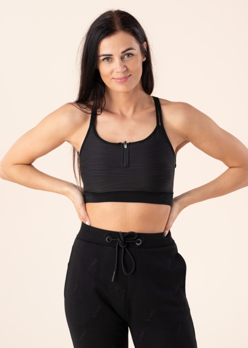 Stilīgais Only sporta krūšturis palīdz padarīt treniņus vēl patīkamākus! Vidēja intensitātes krūšturim ir modernas, paralēlas plecu siksnas un aizmugurē iegriezta daļa ar baltu firmas logotipu un uzrakstu. Priekšpusē ir teksturētas svītras un mazs rāvējslēdzējs. Modelis ir 176 cm garš un valkā S. izmēru.Materiāls: poliesters 80%, elastāns 20%. Krāsa: melna.