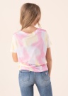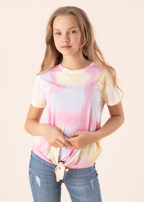 Ar raibu ziemeļblāzmas efektu rotātais Only T-krekls Bria izceļas ar saskaņotu, izplūdušu krāsu pāreju, un vienkāršā piegriezuma kreklu papildina dekoratīvs mezgls priekšpusē vidū pie apakšmalas. Modele ir 146 cm gara un valkā 146. izmēru.