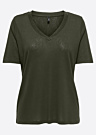 Henrietta sieviešu T-krekls ir ērts un sievišķīgs apģērbs, kas lieliski papildinās jebkuru garderobi. Tas ir veidots ar V-veida kakla izgriezumu un īsām piedurknēm, nodrošinot komfortu un eleganci ikdienas valkāšanai. Krekla apkakli rotā mirdzoši akmentiņi, kas piešķir tam īpašu šarmu un pievilcību.