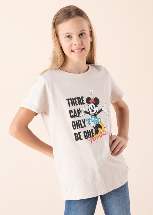 Pasteļtoņu Minni Mouse T-krekls ir katras Disney fanu iecienītākais apģērbs! T-krekls ar patīkamu, taisnu piegriezumu un BCI marķējumu ir veidots retro stilā, valkātājai sagādā prieku ar mīkstu audumu un ērtu piegriezumu. Kakla izgriezumu rotā valnītis un centrā atrodas uzraksts “There can only be one Minnie”,ar priecīgas peles Minnijas attēlu. Modeles augums 146 cm, valkā 146/152 izmēru.