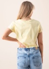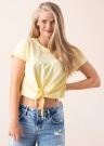 Only T-krekls Lisa ir jauneklīgs un elpojošs, piemērots vasarai. Krekla ar īsāku garumu priekšējā, apakšējā daļā ir mezgls, bet priekšējā daļā – izteiksmīgs uzraksts. Modele ir 169 cm gara, valkā S izmēru.