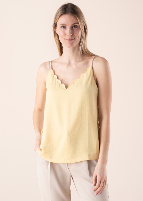 Izteikti sievišķīgais Only topiņš Debbie ir izgatavots no patīkami mīksta un labi krītoša poliestera auduma, nodrošinot valkātājai lielisku, brīvu un ērtu sajūtu jebkurā mirklī! Smalkākas plecu lentes regulējamas, un V veida apkakli rotā efektīga viļņveida apmale. Blūzes priekšpuse iekšpusē oderēta ar gaisīgu audumu. Modeles augums 177 cm, valkā 36. izmēru.