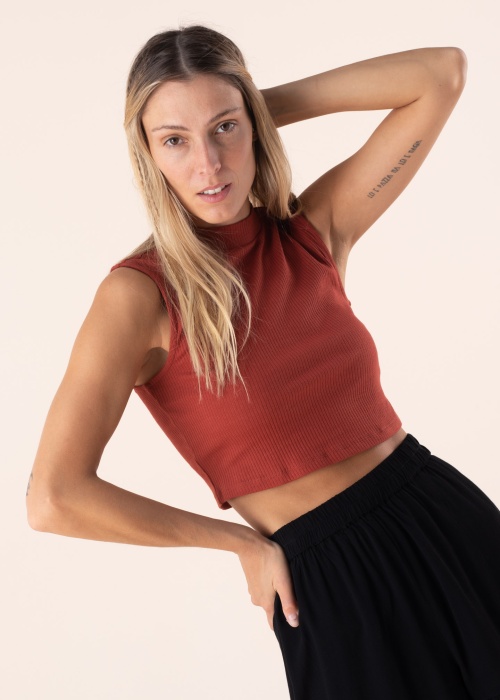 Only tops ar īsāku Cropped piegriezumu ir ideāli piemērots valkāšanai siltākā vasaras laikā un ir viegli to saskaņot pasākumu ar šortiem, džinsiem vai svārkiem. Produktam ir smalks, rievots materiāls, kas nodrošina lielisku saķeri. O veida, pieticīgi pacelta apkakle patīkami turas ap valkātāja kaklu un tādējādi rada atturīgu kopējo iespaidu. Pateicoties tā maigumam un elastībai, valkāšanas komforts tiek garantēts pat aktīvākās situācijās. Modeles augums ir 177 cm un valkā S izmēru.