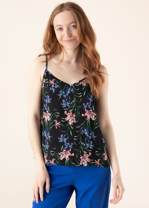 Jauks Only tops der valkāšanai vasarā. Ar ziedu rakstu tops ir bez piedurknēm un ar brīvāka piegriezuma. Piedevām prece ir brīvi krītošs un gaisīgs. Plecu siksnu garums ir regulējams. LENZING ™ ECOVERO ™ šķiedra, kas iegūta no sertificētiem atjaunojamiem koksnes avotiem, izmantojot videi draudzīgu ražošanas procesu un ievērojot augstus vides standartus. Foto: augums 174 cm valkā 36 izmēru.