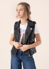 Modernā Only veste Michela ir lieliska valkāšanai brīvā laikā. Vesti ir viegli uzvilkt uz dažādiem krekliem, blūzēm, kā arī tā ir piemērota valkāšanai vēsākā laikā. Vestes dizains ir izteiksmīgs un moderns. Akentu piešķir platāka apkakle ar spiedpogām. Veste priekšpusē aizdarāma ar rāvējslēdzēju, sānos kabata ar rāvējslēdzēju, kurā ērti glabāt svarīgus priekšmetus. Uz pleciem ādas detaļas un aizmuguri rotā efektīgas ādas bārkstis. Poliestera iekšējā odere ir mīksta. Modeļa augums 146 cm, valkā 146. izmēru. Garums no apkakles līdz apakšmalai 45,5 cm. Materiāls: poliesters 85%, kokvilna 10%, viskoze 5%. Krāsa: melna.