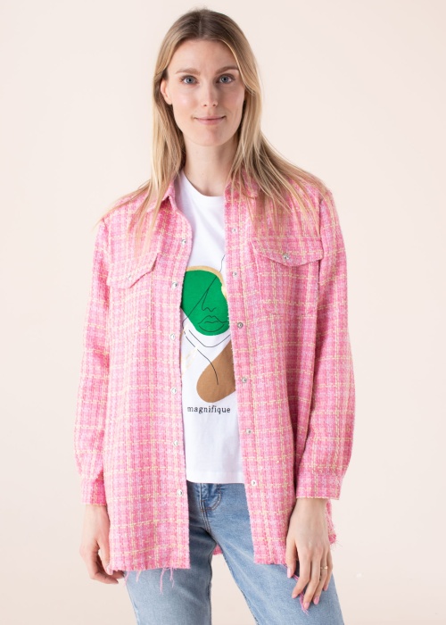 Drosmīgā un spilgtā Only jaka Leoma piesaista sievieti, kuras pašapziņa ir jau metru attālumā! Spilgtā diega rūtainais raksts padara burvīgo rozā toni aizraujošu, padarot jakas augšējo audumu unikālu! Jaka priekšpusē aizdarāma ar spiedpogām, kakla izgriezumu norobežo uzgriezta apkakle. Divas priekšējās kabatas ar atlokiem un šķēlumiem piedurkņu malās ir nostiprinātas ar spiedpogām. Neapstrādāta efekta apakšējā mala ar bārkstīm piešķir jauneklīgu tendenci. Modelis ir 177 cm garš un valkā S izmēru. Garums no kakla daļas līdz apakšai 77 cm. Materiāls: 100% poliesters. Krāsa: rozā.