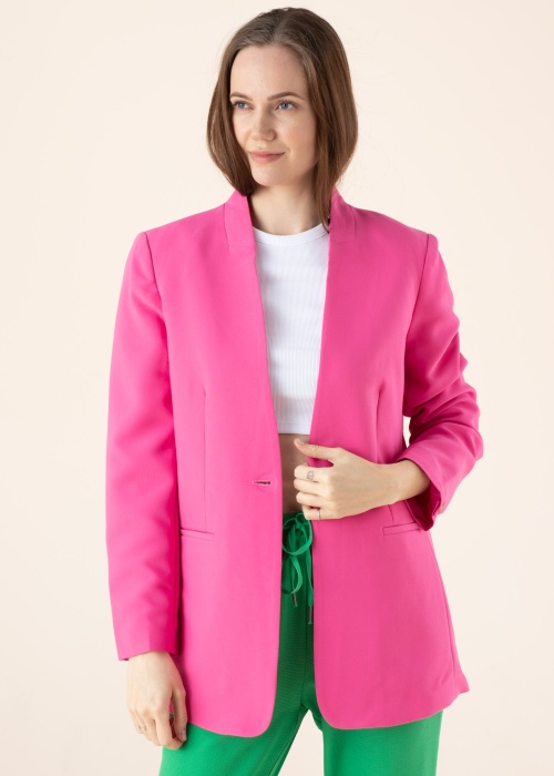 Moderna Only žakete der valkāšanai gan ikdienā, gan formālākos pasākumos. Spilgtas oversize piegriezuma žakete ar taisnu siluetu un ar brīvāka piegriezuma. Priekšpusē ir pogu aizdare un sānos atvērtas kabatas. Prece piešķir apģērbam pabeigtības sajūtu. Foto: augums 175 cm valkā 36 izmēru.
