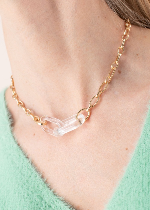 Parfois kaklarota See Through sastāv no izciliem ķēdes elementiem, kuriem pēdējo pieskārienu piešķir divas caurspīdīgas dažāda izmēra šķiltavas detaļas. Rotas garums regulējams līdz 44 cm aiz kakla. Materiāls: dzelzs 60%, sveķi 40%. Krāsa: zeltaina.
