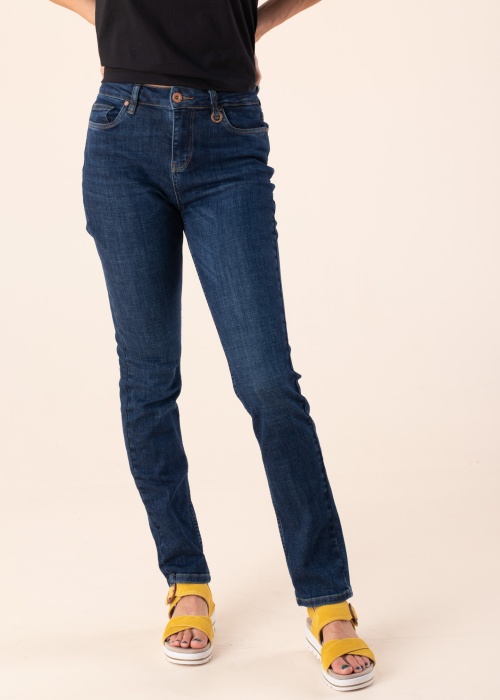 Jaukas, sievišķīgas, taisna piegriezuma Paul Costelloe džinsu bikses Pzliva ir ideāli piemērotas ikdienas valkāšanai. Taisnāka bikšu daļa un augstāka jostasvieta nodrošina vēlamo komfortu. Priekšpusē bikses aizveramas ar pogu un rāvējslēdzēju. Kopā modelim ir piecas kabatas, trīs priekšpusē un divas aizmugurē. Jostas cilpas. Priekšpusi rotā metāla detaļa pie vienas no cilpām. Bikses, kas izgatavotas no izturīgāka auduma, nodrošina izturību un tajā pašā laikā labu elastību. Modele ir 176 cm gara un valkā 27.-32.
