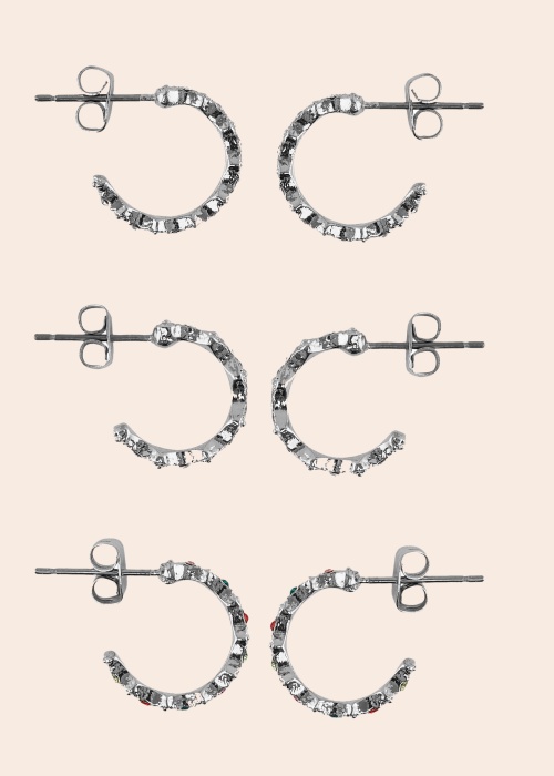 Izsmalcināti un vienkārši pusapaļie gabali auskari Laja. Iepakojumā ir 3 pāri auskaru, kuru augstums ir 1,4 cm.Materiāls: cinks 85%, stikls 10%, titāns 5%. Krāsa: sudraba