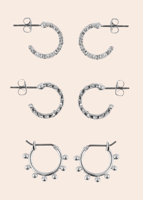 Pieces auskari Lona ir lieliski piemēroti ikdienas valkāšanai, neaizēnojot ikdienas drēbes. Auskaru augstums ir aptuveni 1,8 cm. Iepakojumā ir 3 pāri auskaru.Materiāls: cinks 60%, misiņš 25%, stikls 10%, titāns 5%. Krāsa: sudraba