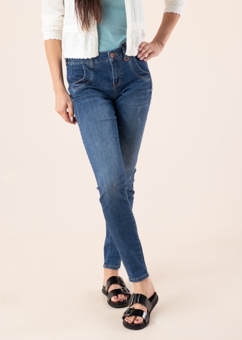 Pulz džinsu bikses Mary ir no patīkami mīksta un elastīga (Stretch) auduma ar vieglu nodiluma izskatu. Vidējas augstuma jostas vietā ir cilpas jostai kuras aizveras priekšpusē ar rāvējslēdzēju un pogu. Džinsu kabatām ir ļoti daudz detaļu, priekšējām kabatām ir dekoratīvi piekariņi, bet aizmugurējām kabatām ir četras: divas parastas, uzšūtas kabatas, kuru iekšpusē savukārt ir divas mazākas kabatas. Bikšu piegriezums ir radīts, paturot prātā komfortu un mobilitāti, jostasvieta ir plašāka, bet stilba daļa ir ar šauru ''skinny leg'' piegriezumu. Pie jostas cilpas piestiproināts neliels gredzens ar zīmola logotipu, kuru pēc vēlēšanās var arī noņemt. Materiāla īpašību dēļ bikses pirmajā mazgāšanas reizē var sarauties līdz pat 5%. Modeles augums 176 cm, valkā 27/32 izmēru.