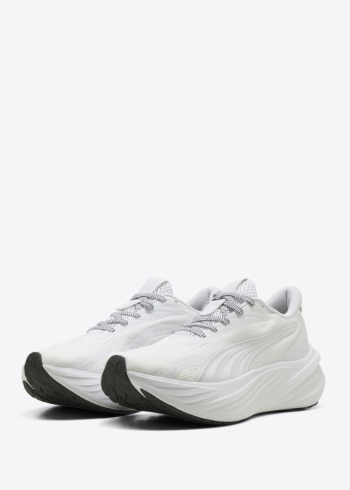 Puma sieviešu skriešanas apavi Maxima Pro ir sportiski, viegli un patīkami valkājami, tāpēc tie labi noder gan ikdienas treniņiem, gan aktīvām pastaigām. \nTie veidoti tā, lai kustības būtu plūstošas un solis — drošs un pārliecinošs. \nAugšdaļā redzama zīmola etiķete, reljefains raksts un šņores, kas apaviem piešķir mūsdienīgu, sakoptu izskatu. \nTrīsdesmit devītā izmēra pāra svars ir trīs simti četrdesmit grami.