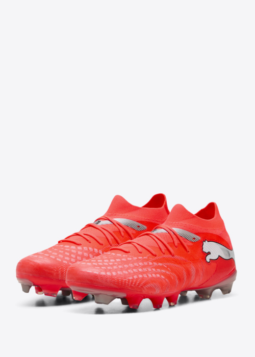 Puma vīriešu futbola apavi Future 9 Match FG/AG ir spilgti un sportiski, veidoti pārliecinošai spēlei gan uz dabīgā zāliena, gan uz mākslīgā seguma. \nTo izteiktais dizains palīdz izcelties laukumā un piešķir kustībām vairāk dinamikas. \nAizmugurē redzamais zīmola logotips pievērš uzmanību un skaidri iezīmē apavu raksturu. \nApavu virspusi rotā interesants raksts, bet virsdaļā esošās šņores ļauj tos stingri un droši pielāgot kājai. \n46. izmēra pāra svars ir 319 grami.