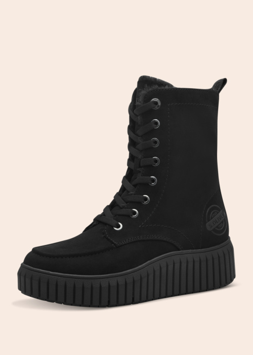 s.Oliver sieviešu puszābaki ir lieliski piemēroti ziemai, jo tie ir gan silti, gan viegli, nodrošinot komfortu ik uz soļa. Platformas zole un Soft Foam mīkstā iekšzole garantē maksimālu ērtumu, savukārt dizaina šuve purngalā un sasienamā josta priekšpusē piešķir stilīgu izskatu. Turklāt zābakiem ir sānu rāvējslēdzējs un logo uz papēža, kas piešķir tiem unikālu un omulīgu dizainu.
