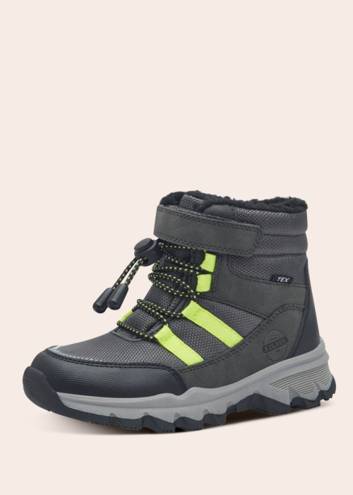 s.Oliver zēnu ziemas zābaki ir lieliski piemēroti aktīvai ikdienas lietošanai, piedāvājot sportisku un komfortablu dizainu. Zābaku sānos ir dekoratīvs elements un zīmola etiķete, kas piešķir stilīgu izskatu, savukārt priekšpusē ir klipsis un purngalā atstarotājs, kas nodrošina papildu drošību. Pateicoties Tex membrānai, šie apavi ir ūdens atgrūdoši un elpojoši, nodrošinot siltumu un komfortu jebkuros laikapstākļos.