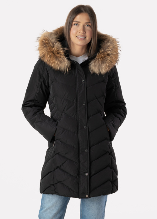 Saki sieviešu dūnu mētelis ir izcila un kvalitatīva izvēle, kas izceļas ar savu garo piegriezumu un akcentēto vidukli. Šis mētelis ne tikai nodrošina siltumu, bet arī apņem Tevi ar savu maigumu, sniedzot komfortu aukstajās dienās. Priekšpusē esošais rāvējslēdzējs un mājīgā kapuce ar pūkainu dabīgā kažoka apdari piešķir mētelim eleganci un praktiskumu. Iekšpusē ir krūšu kabata ar rāvējslēdzēju, kas ir ērts risinājums Tavu vērtīgo lietu glabāšanai.