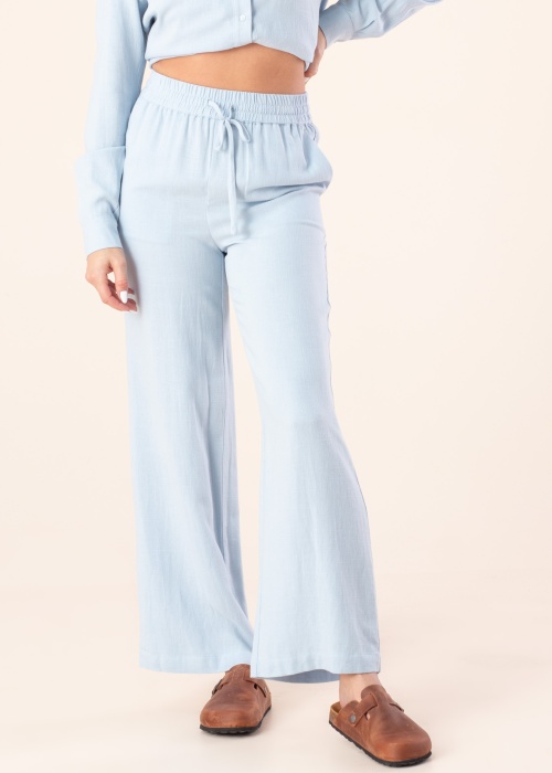 Vasarīgas Selected Femme bikses der valkāšanai ikdienā. Jaukas un ar paaugstinātu jostasvietu bikses ir brīvi krītošas un ar platiem staru galiem. Komfortu piešķir atvērtas kabatas sānā un uz jostas ir gumija , kā arī tuneļa aukla. Foto: augums 176 cm valkā 36 izmēru.